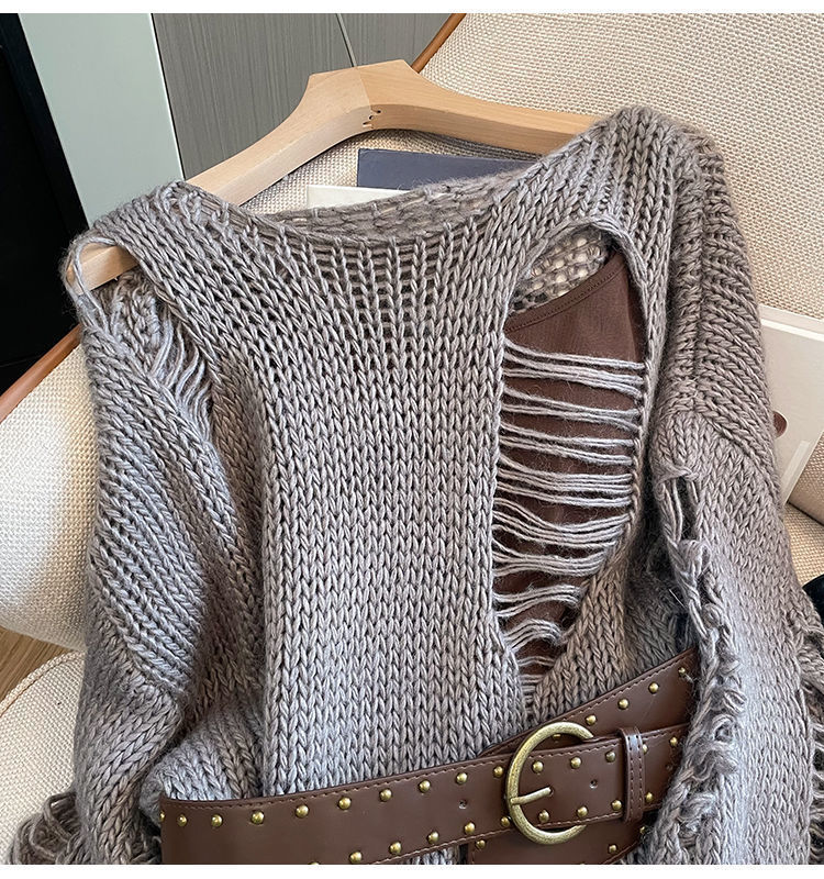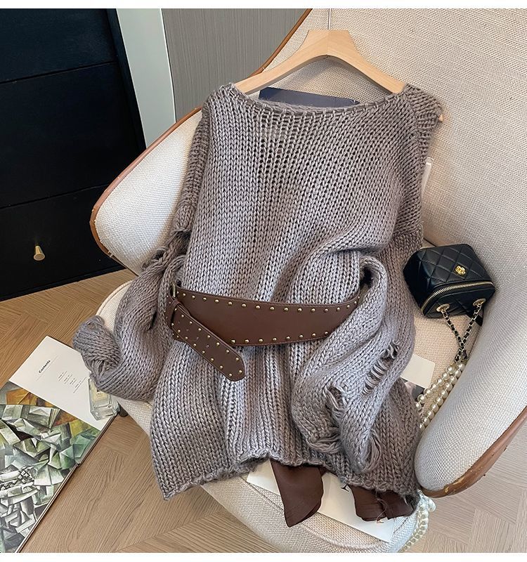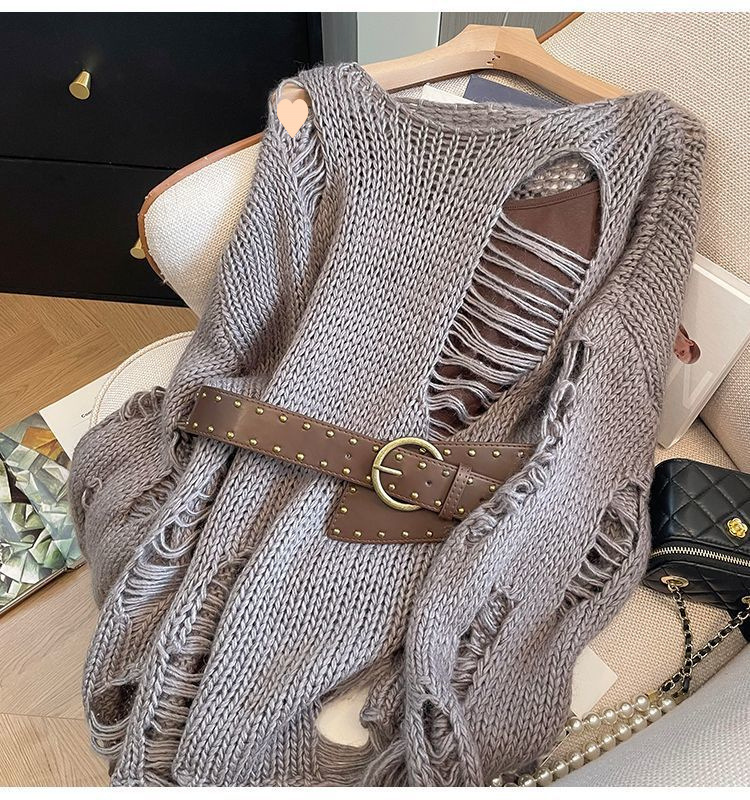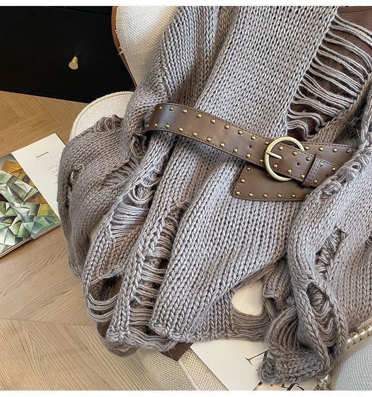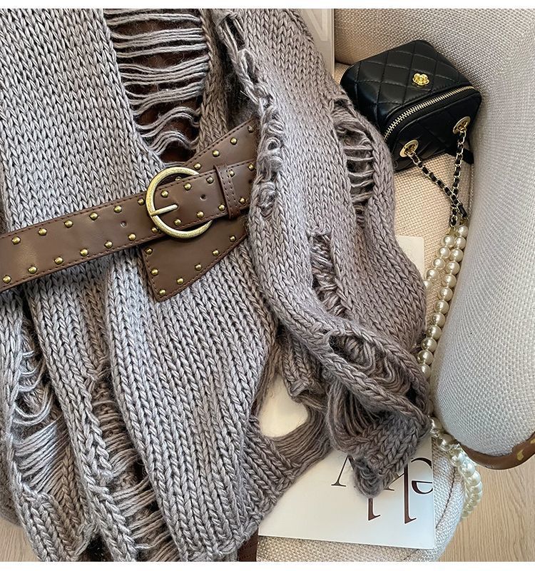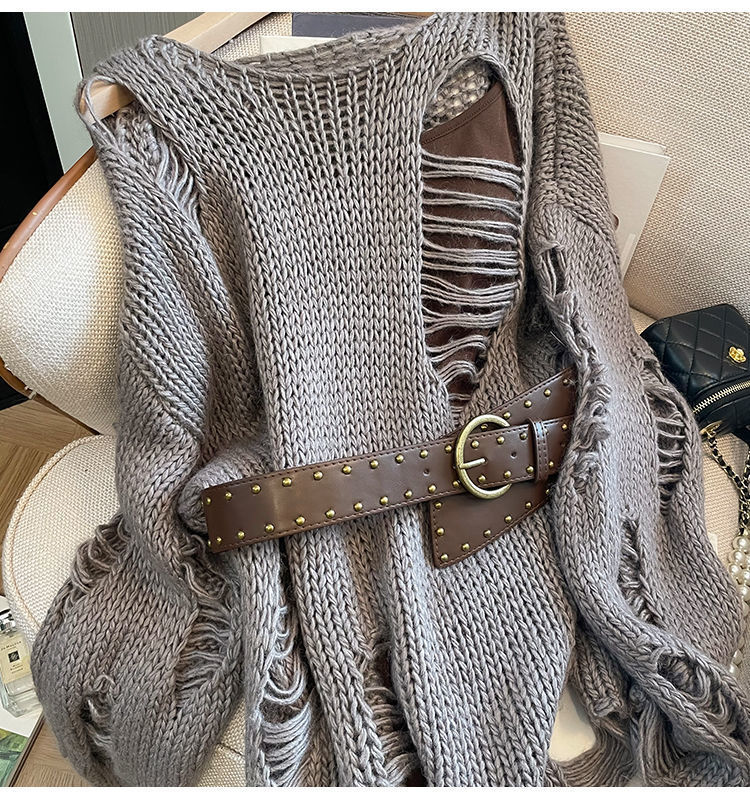 American-style Retro Hollow-out Long-sleeve Sweater With Belt