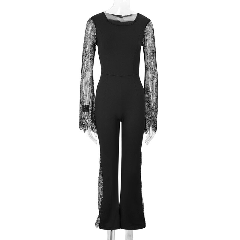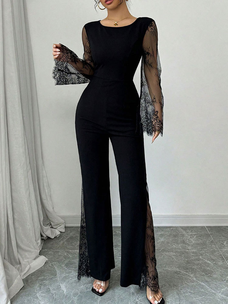 Lace-embellished Long-sleeve Crew-neck Bodycon Jumpsuit With A Cinched Waist And Hip-lifting Design