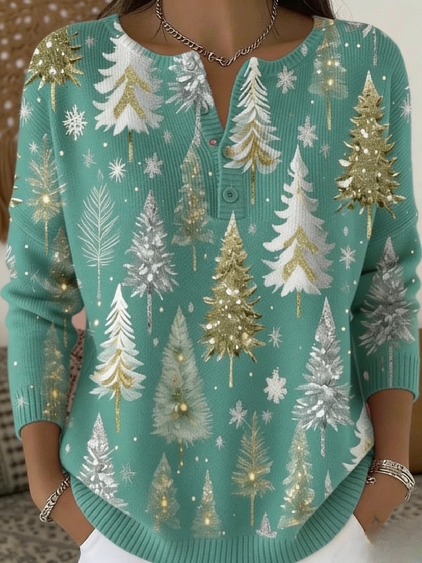 New Retro 3D Digital-Print Polo Sweater With Three Buttons And A Crew Neck