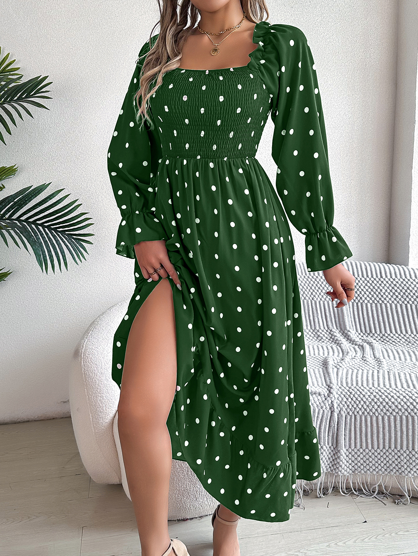 Women's Scalloped Hem Square Neck Polka Dot Flared Maxi Dress